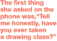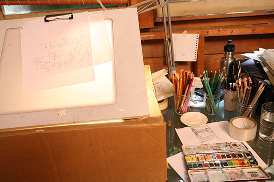 Once I get a drawing that I like, I trace it onto watercolor paper with a black colored pencil using a big translucent board, back lit.