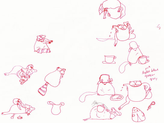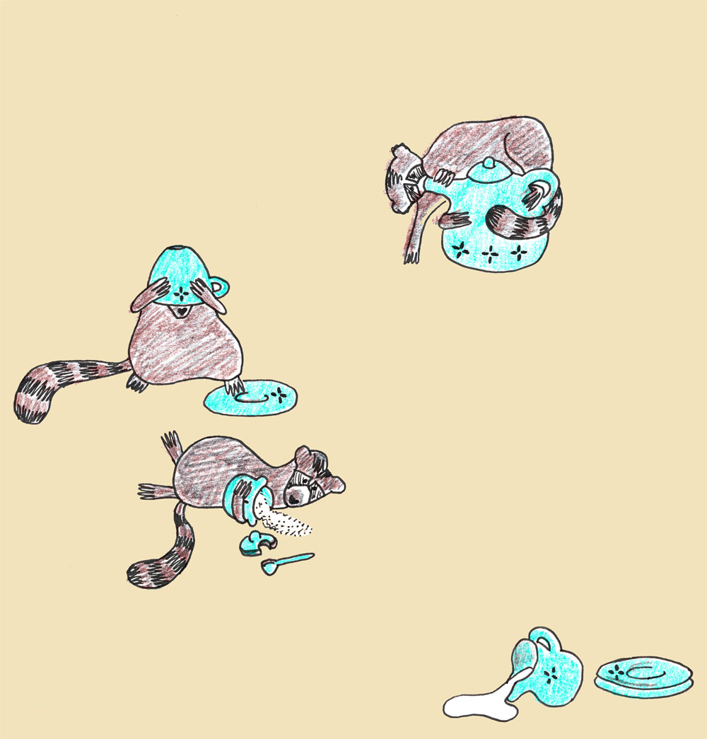For starters, I think about raccoons a lot, probably way more than I should.   So I figured I should probably use some raccoons for my piece. Raccoons are busy bodies, up to no good, with comical faces and chubby middles. But what will they be doing in my drawing? I was trying to thing of something civilized they could do in their own way and low and behold the tea party scene came quite naturally. I always sketch with whatever pen or marker is closest to me. Here’s the initial sketch.