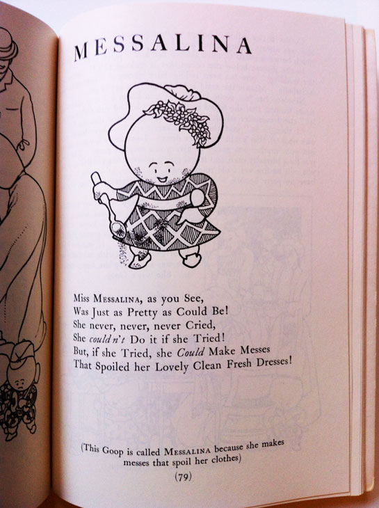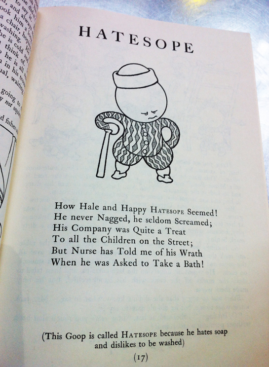 A few years ago I came across two of Frank Gelett Burgess’ books about the Goops at a small and wonderful library sale in Sherman, CT. I wanted to share with you Goop Tales because it is hilarious! It’s the 1973 Dover edition of the “unbridged and unaltered” original, published in 1904 by Frederick A Stokes Company. I can’t believe how current these old Goops seem! So what is a Goop, and more importantly are YOU one? Basically they are symbols of human faults. Each Goop is lovable but with one flaw which is how one gets its name. They are elaborately dressed, have giant circle heads, to remind you they are childlike, and are cute but with a tiny pinch of creepy!Each page spread contains a short scene on the left with the named Goop showing how they got there name, and on the right is a bigger drawing of the Goop with a poem and a parenthetical explanation just in case you aren’t absolutely sure why they are named that way. Each one made me chuckle and reminds me of being little and playing with a big group of kids and all the different personalities that came out during a game! I’m posting a few favorites here but there are so many more in the book.