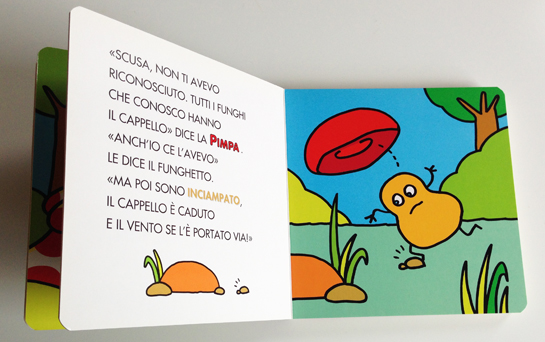 Sneak peek: Francesco Tullio Altan is an Italian author/illustrator who has influenced me enormously. Separate post on him to come. In the meantime, I’ll leave you with this image from Altan’s board book: Pimpa e il fungo sognatore (Pimpa and the daydreaming mushroom). As you can see, the mushroom loses his cap!