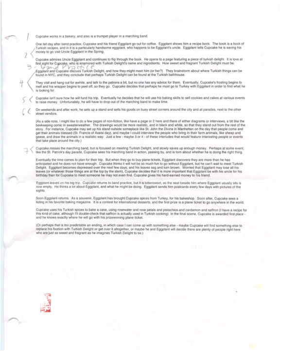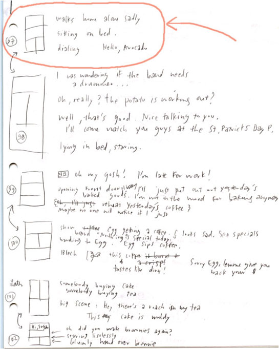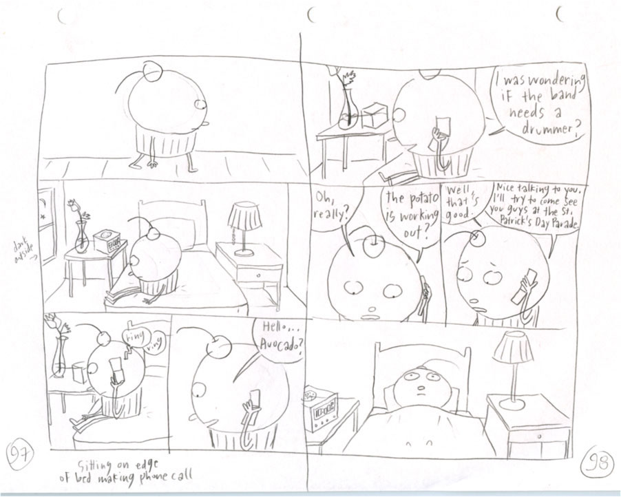 Sara: First I write out what will happen. Then I break up the events into pages and the pages into panels. I write in words what will happen in each panel. Then I thumbnail it.